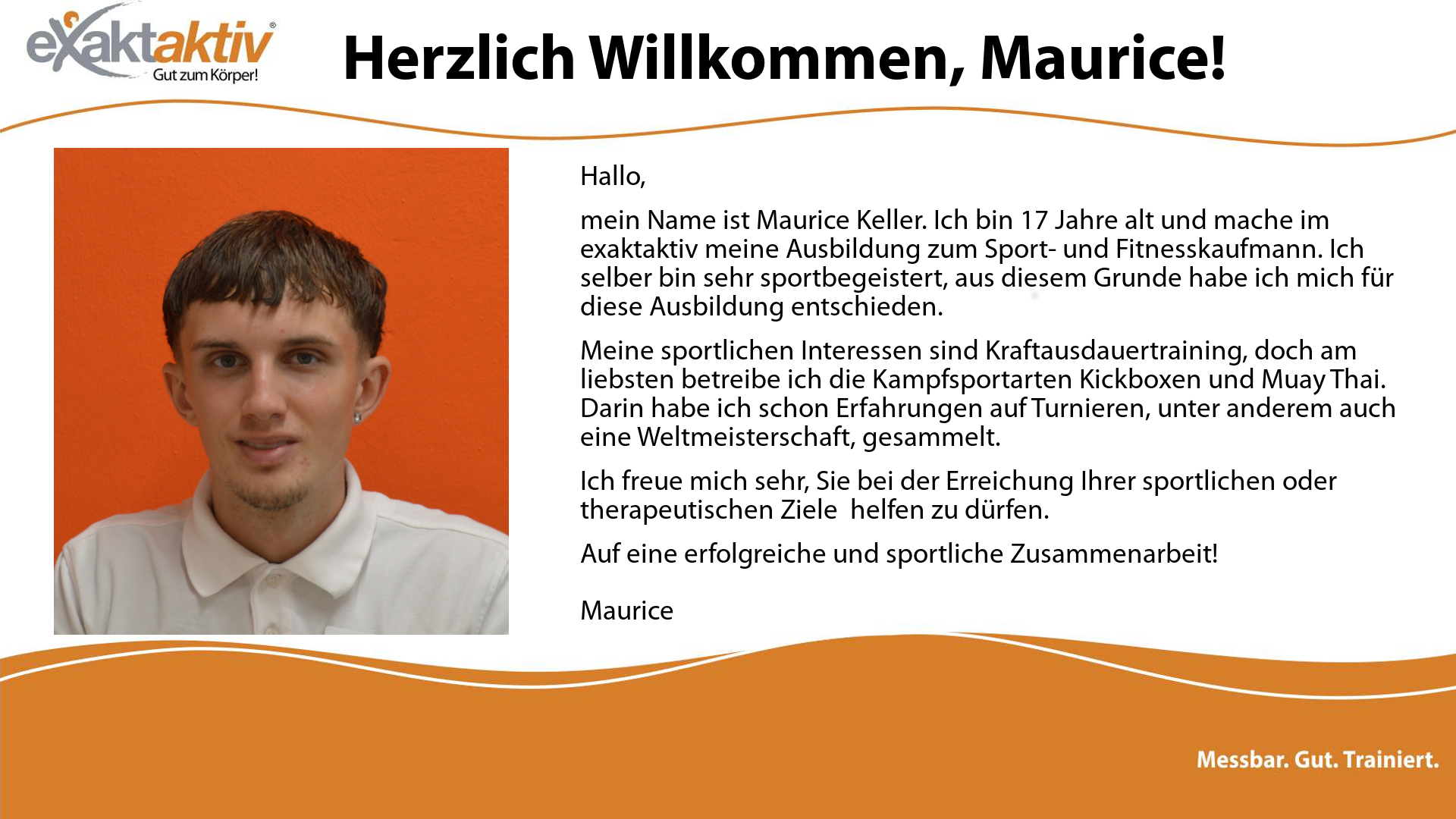 mein Name ist Maurice Keller. Ich bin 17 Jahre alt und mache im exaktaktiv meine Ausbildung zum Sport- und Fitnesskaufmann. Ich selber bin sehr sportbegeistert, aus diesem Grunde habe ich mich für diese Ausbildung entschieden.
